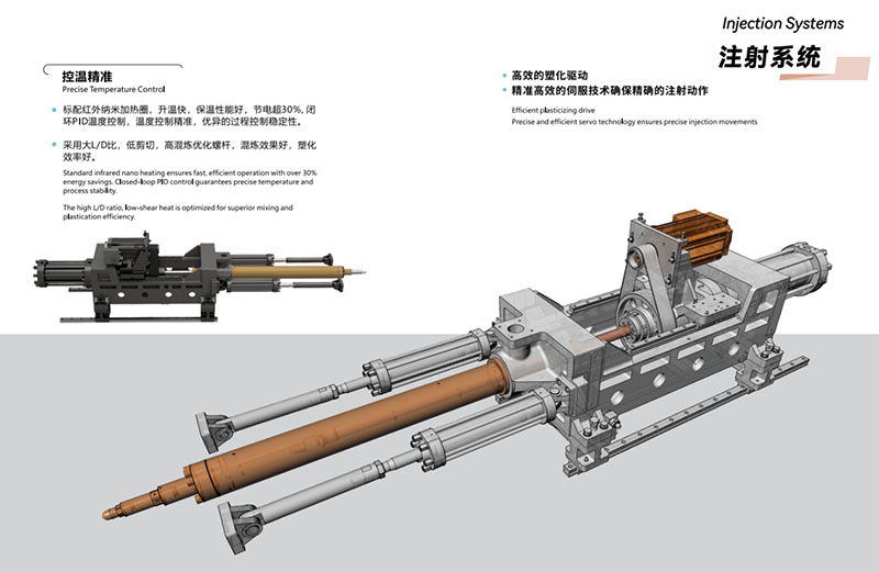 Once again, he saw the unique injection structure of the Lisong injection molding machine, equipped with infrared nano heating coils as standard, which heats up quickly, has good insulation performance, saves more than 30% electricity, closed-loop PID temperature control, precise temperature control, and excellent process control stability. Efficient plasticizing drive and precise servo technology ensure precise injection actions and systems, ensuring stable and precise products in each chamber. Adopting a large L/D ratio, low shear, and high mixing optimization screw, the mixing effect is good and the plasticization efficiency is good.